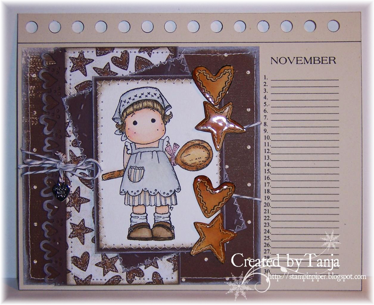 Hallo Ihr Lieben, schön, dass Ihr vorbei schaut. Heute habe ich ein weiteres Kalenderblatt, den November. Er steht ganz im Zeichen des vorweihnachtlichen Backens. Damit es nach Backen aussieht, habe ich die Ränder des braunen Papiers mit vanillefarbener Stempelfarbe gewischt. Die Lebkuchen habe ich nach dem Colorieren dick mit Diamond Glos überzogen, sie sehen richtig lecker aus :) Den Sketch habe ich bei The Sweet Stop gefunden mit dem Extra "how sweet". "Something sweet" lautet auch das Thema bei Stamp Something und "In Stitches" bei Crafty Creations.Hello my dears, thanks for hopping by ... today I have another calendar page to show, the november. The theme is christmas bakery and make it look like flour I distressed the edges with vanilla ink. I covered the gingerbread hearts and stars with a thick layer of Diamond Gloss, this looks so yummy :) I found the sketch at The Sweet Stop with the extra spin "how sweet". "Something sweet" is the theme at Stamp Something and "In Stitches" at Crafty Creations.